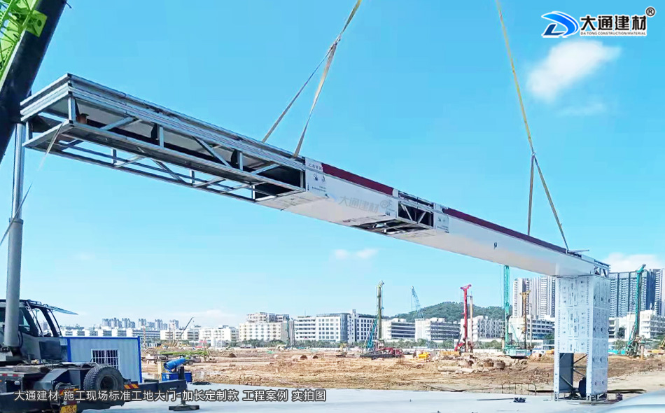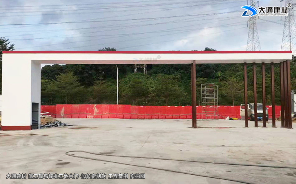 深圳市大通建材有限公司提供標準工地大門生產定制/配送安裝等服務,標準工地大門常規尺寸為14800mm*5600MM,一些項目工程有特殊需求的可以根據實際需求進行定制化生產,如下面展示的這款鋼結構標準工地大門定制加長款的尺寸是16800mm*5600MM,其它尺寸工地大門有需求的亦可定制化生產。