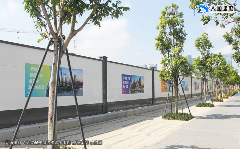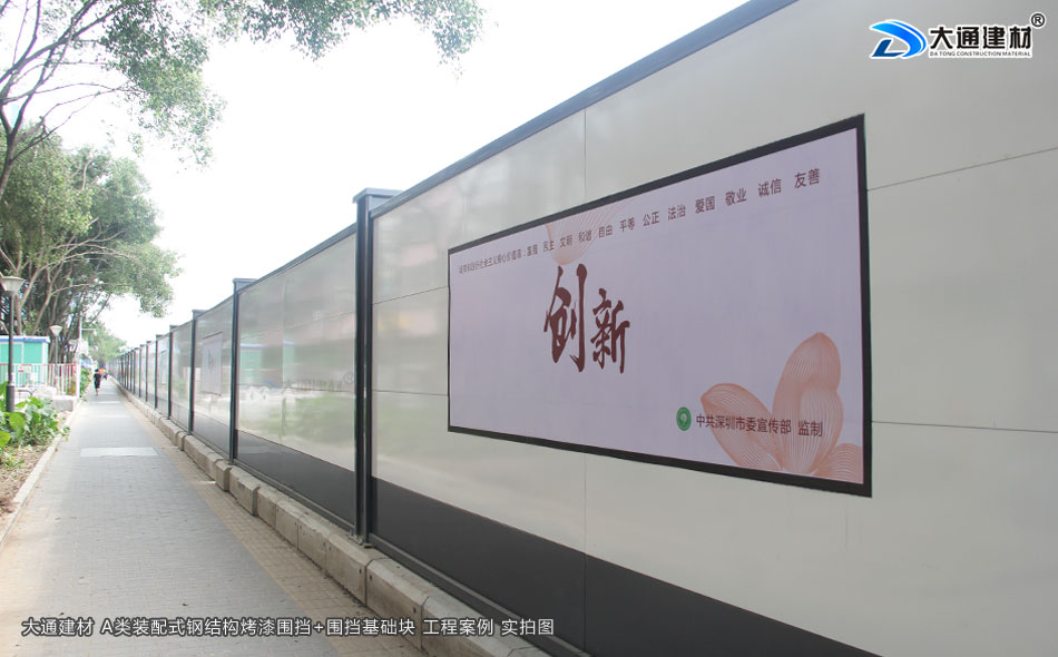 大通建材A類裝配式鋼圍擋,堅持深圳質量,關注城市美學,培育精益求精的工匠精神,結合深圳開放、創(chuàng)新、現(xiàn)代、濱海的城市的特征和公益宣傳的要求。提供具備不同區(qū)域環(huán)境特點的外觀設計方案,外觀顏色可以是白色+深灰色烤漆擋板(亦可是全白色烤漆擋板),美觀大氣的現(xiàn)代風格;再結合城市區(qū)域特點,分片區(qū)、分道路、分街景各自選用同類風格圍擋,營造美觀、整潔的城市環(huán)境的同時,實現(xiàn)圍擋風格區(qū)域性的協(xié)調(diào)統(tǒng)一。