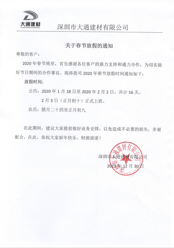 - 深圳市大通建材有限公司“2025年春節(jié)”放假通知2025-01-08