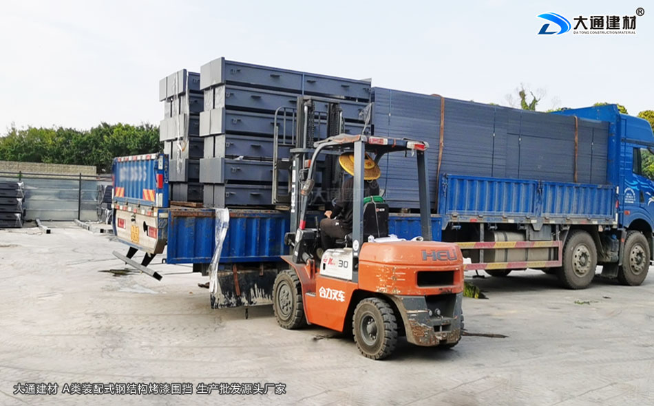 施工安全方案解決工程師,24小時在線等候您的咨詢!圍擋生產廠家深圳大通建材,給東莞客戶定制的A類增高款裝配式烤漆鋼結構圍擋 裝車發貨中,敬請驗收。
