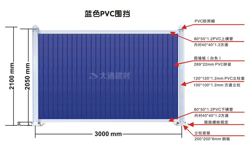 上圖展示的是大通藍色PVC圍擋 規格參數圖