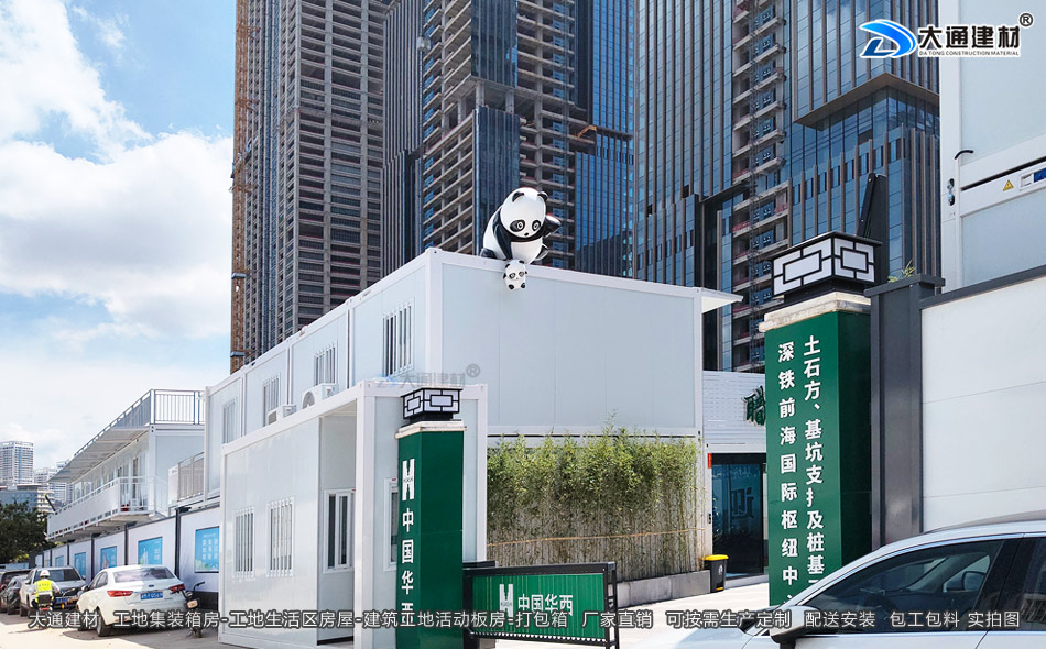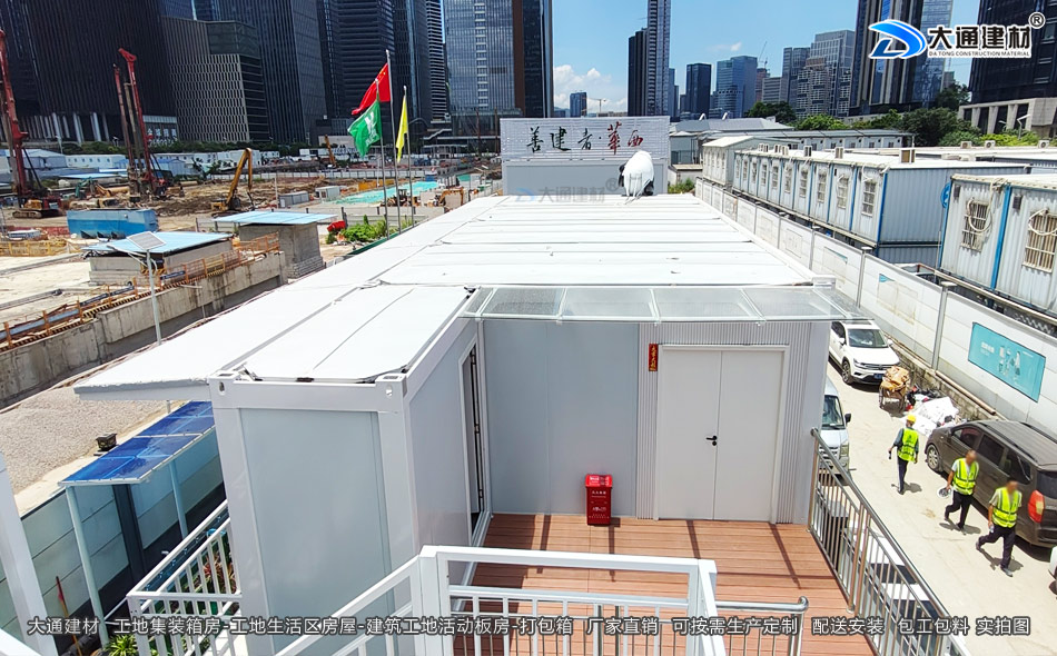 在深鐵前海國際樞紐中心T7土石方、基坑支護及樁基工程項目的工地生活區(qū)房屋,選用的是深圳市大通建材生產(chǎn)銷售的工地集裝箱房。此項目工程的工地生活區(qū)箱房最基礎(chǔ)的,是作為工人宿舍使用。經(jīng)過改造的集裝箱房,內(nèi)部配備上下鋪床位,安裝了門窗、照明設(shè)施和通風(fēng)設(shè)備,有的還配備了空調(diào)。原本冰冷的鋼鐵箱體,被劃分成一個個溫馨的居住單元,為辛苦勞作一天的工人提供遮風(fēng)擋雨、休息安睡的場所,同時配有廚房、雜物間、洗手間等。為了提升居住體驗,此工地還在集裝箱房外搭建遮陽棚、洗漱區(qū)等配套設(shè)施,讓工人在忙碌的工作之余感受到生活的便利。
