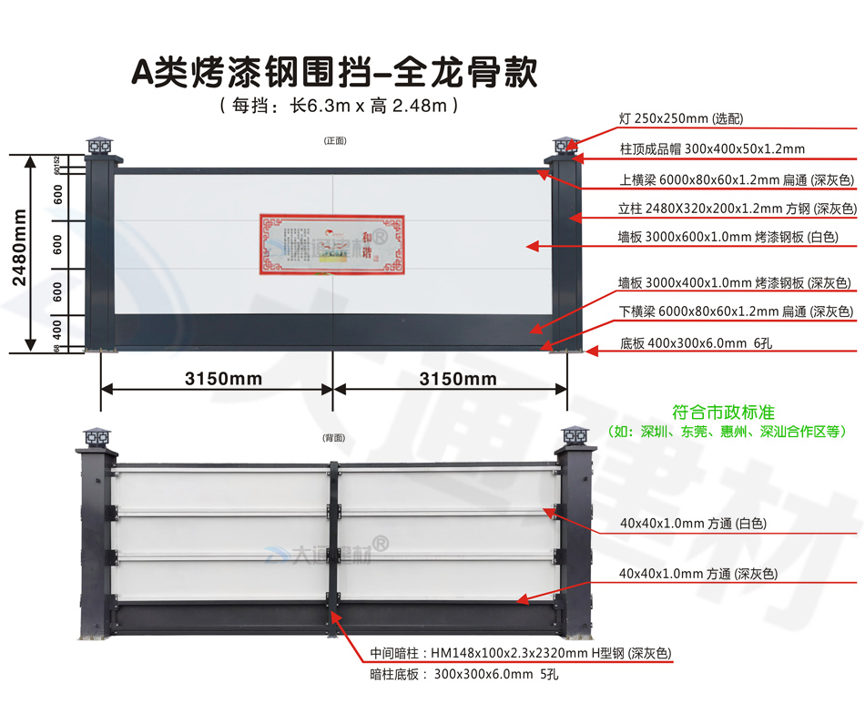 大通建材A類烤漆鋼圍擋全龍骨款適用于市政建設施工、房地產項目施工、地鐵項目施工、學校修建、管網改造、小區改造、城市建設、道路施工等工程使用