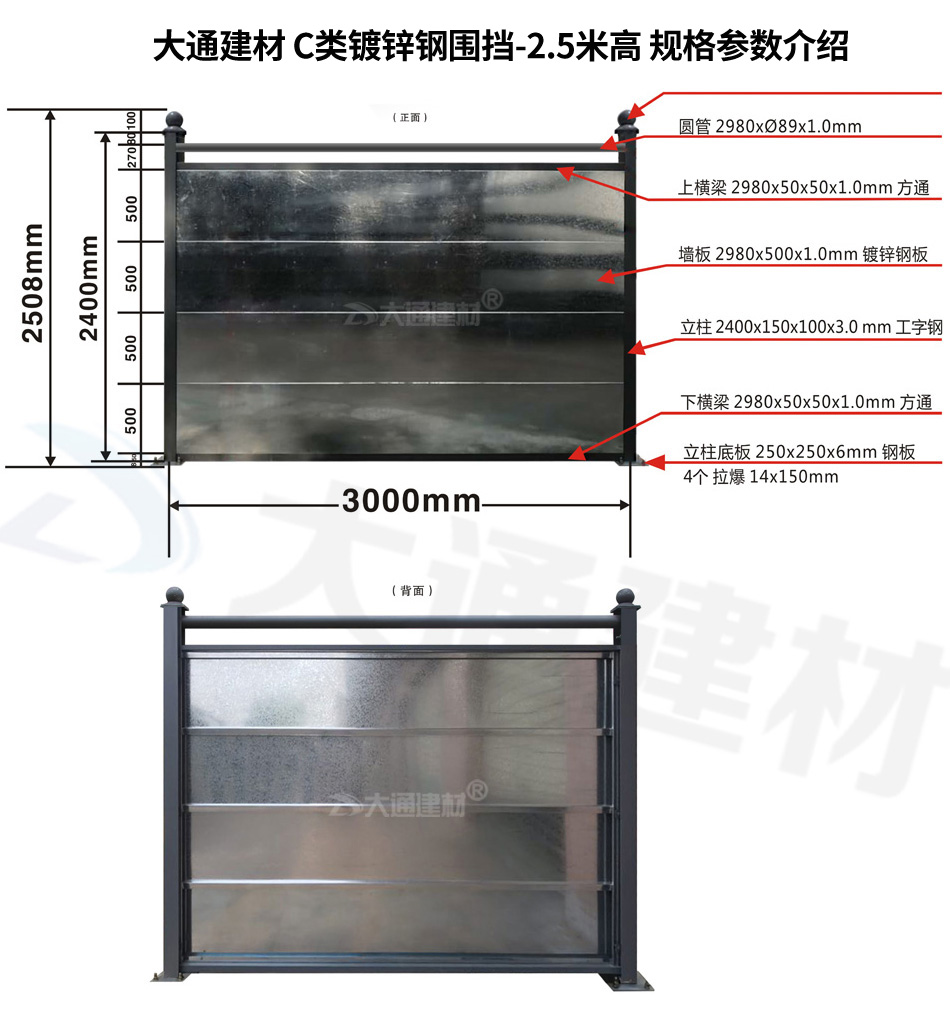 | 大通建材 C類鋼結構圍擋-鍍鋅板款(每擋:長3米、高2.5米)規(guī)格參數(shù) | |||||