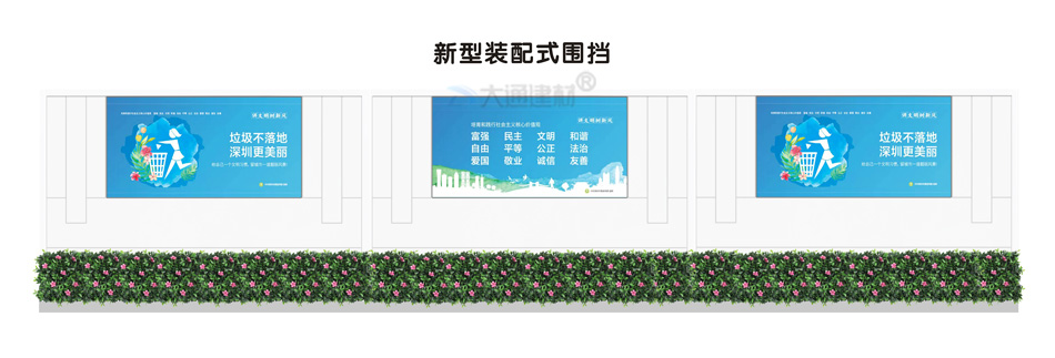 深圳市大通建材生產(chǎn)的 新型裝配式圍擋+高檔綠植圍擋 符合深圳市住建局統(tǒng)一要求的圍擋標(biāo)準(zhǔn),常規(guī)尺寸的圍擋有現(xiàn)貨,而對圍擋尺寸、顏色等有特殊要求的可按實(shí)際需求定制化生產(chǎn),了解更多“大通圍擋規(guī)格與價格”的詳情請致電咨詢 13826562448 梁先生